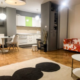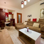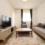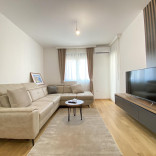 Nov, luksuzan stan. Izdaje se kompletno namjesten sa novim i modernim namjestajem. Struktura : ulazni hodnik, dnevni boravak, kuhinja sa trpezarijom, dvije spavace sobe, dva kupatila i velika terasa 16 m2. Klimatizovan je, podovi su parket i keramika, a stolarija je drvena i eloksirana. Ima podno grijanje u kuhinji i kupatilu, plazma tv, masinu za susenje vesa. Stanu pripada i jedno garazno mjesto. Zgrada ima i lift.